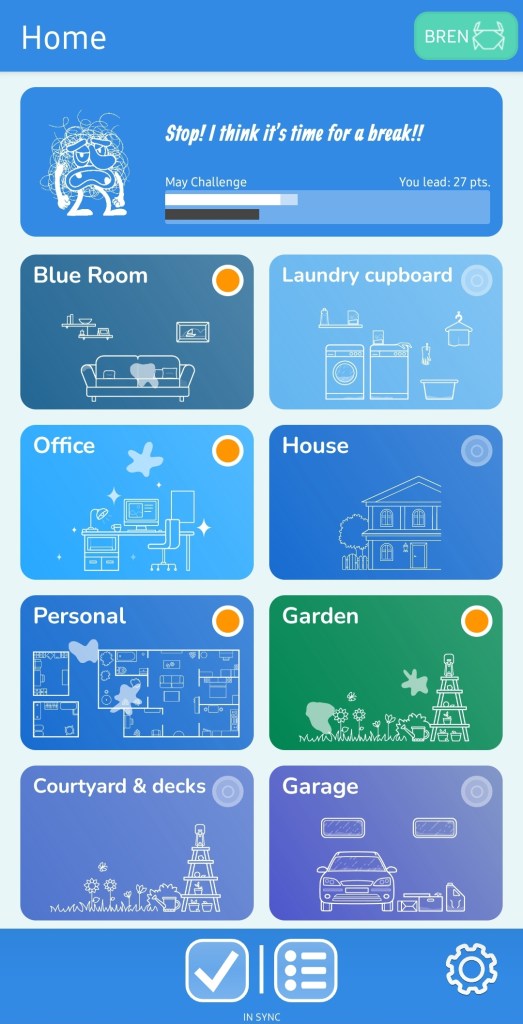 Once you are sufficiently set up, Tody will generate todays’ to-do list for you, and you simply go about your day checking off the things on your list. For the duration of the current calendar month you will gain points for each of the things you tick off. Dusty will do their level best to run around and mess up the house for you and earn points against you. And therein lies the best trick of all. It becomes a race against an imaginary dust cloud who is actually the one making the mess. It’s not me. It’s not my fault the house is messy. It’s Dusty.